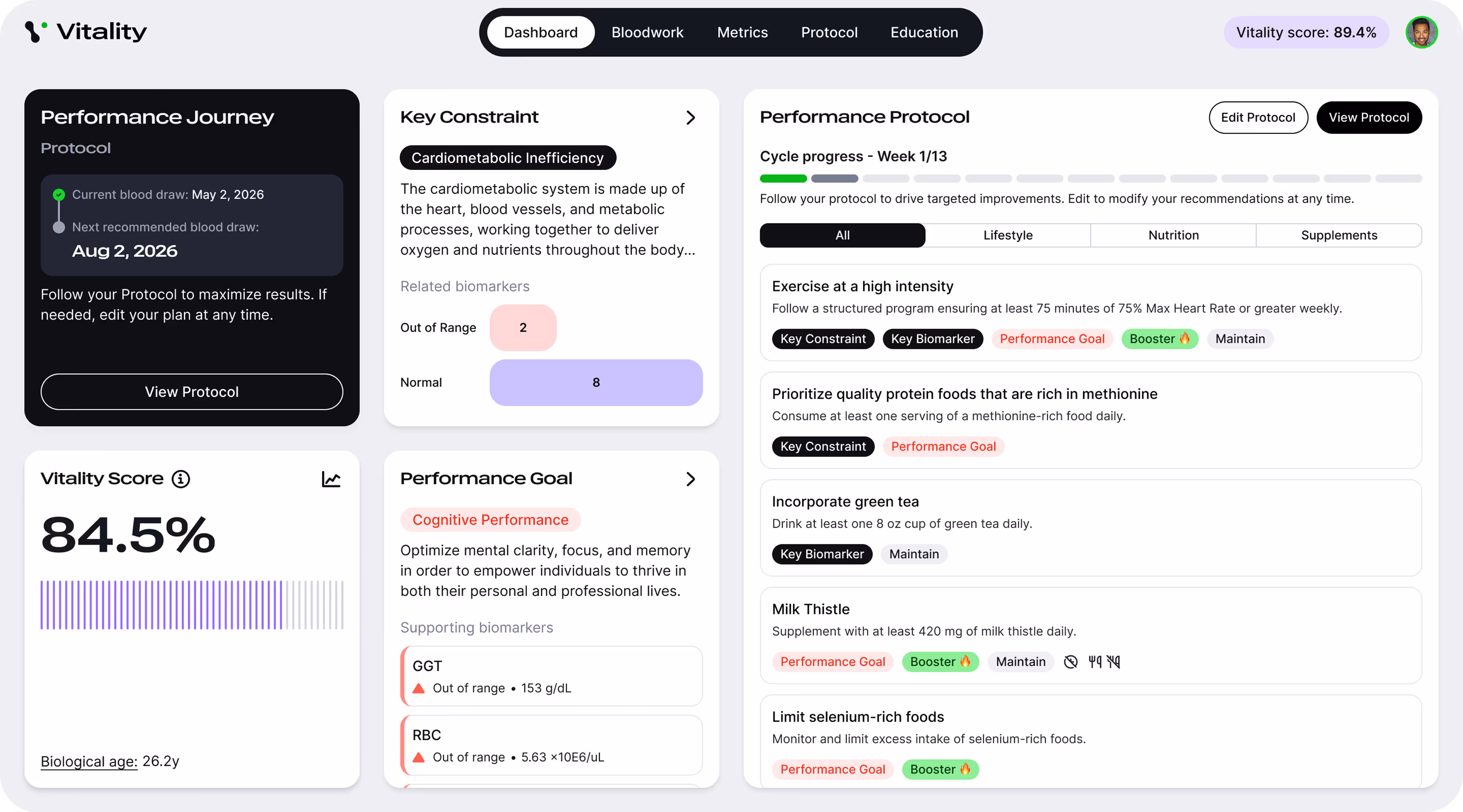 Vitality turns your bloodwork into personalized protocols that unlock energy, resilience, and more so you perform at your best in everything you do.