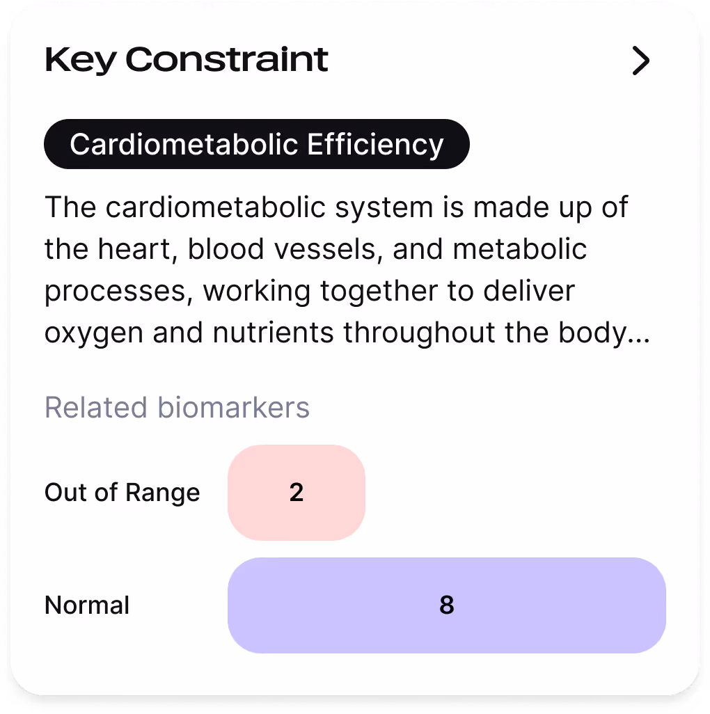 Your Key Constraint is your greatest opportunity for improvement. Each constraint is identified through Vitality’s deep biomarker analysis. Addressing the biggest lever in your physiology unlocks system-wide benefits.
