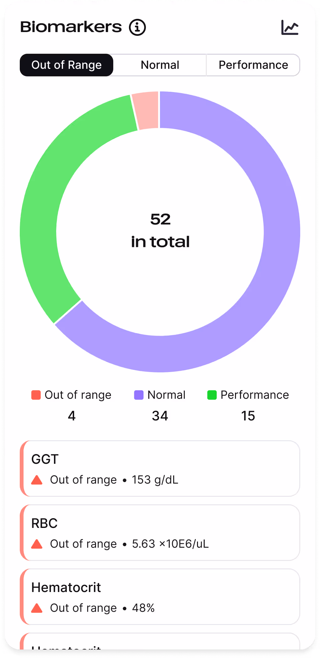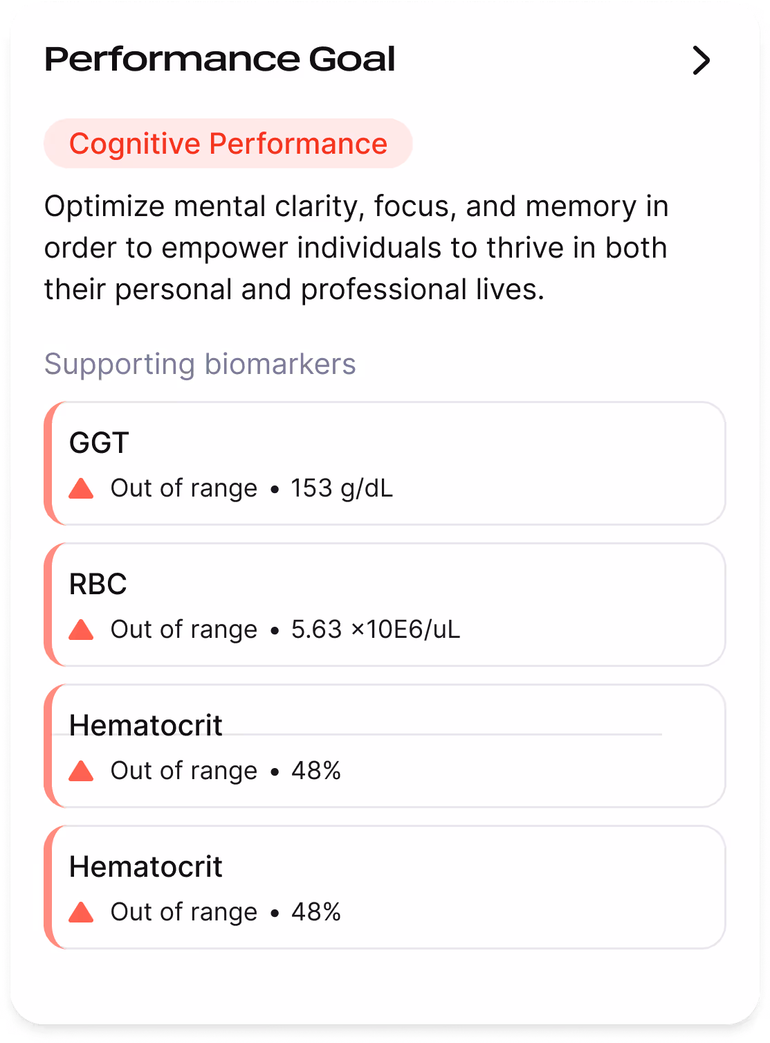 Biomarkers are blood-based signals that reveal how your body’s systems function, helping define your Key Constraint, Performance Goal, and Functional Areas. Dive into individual markers for an extra detailed view.