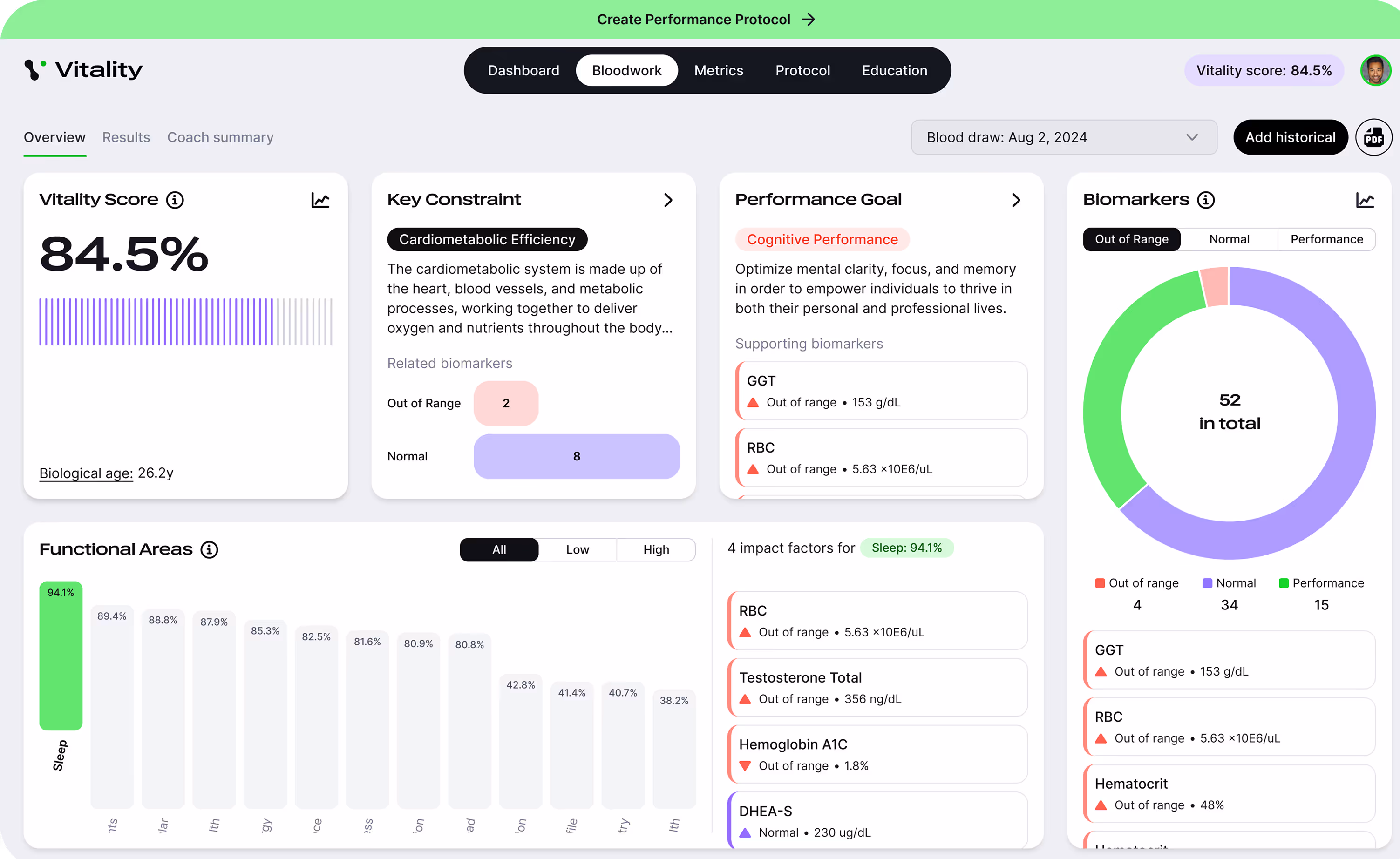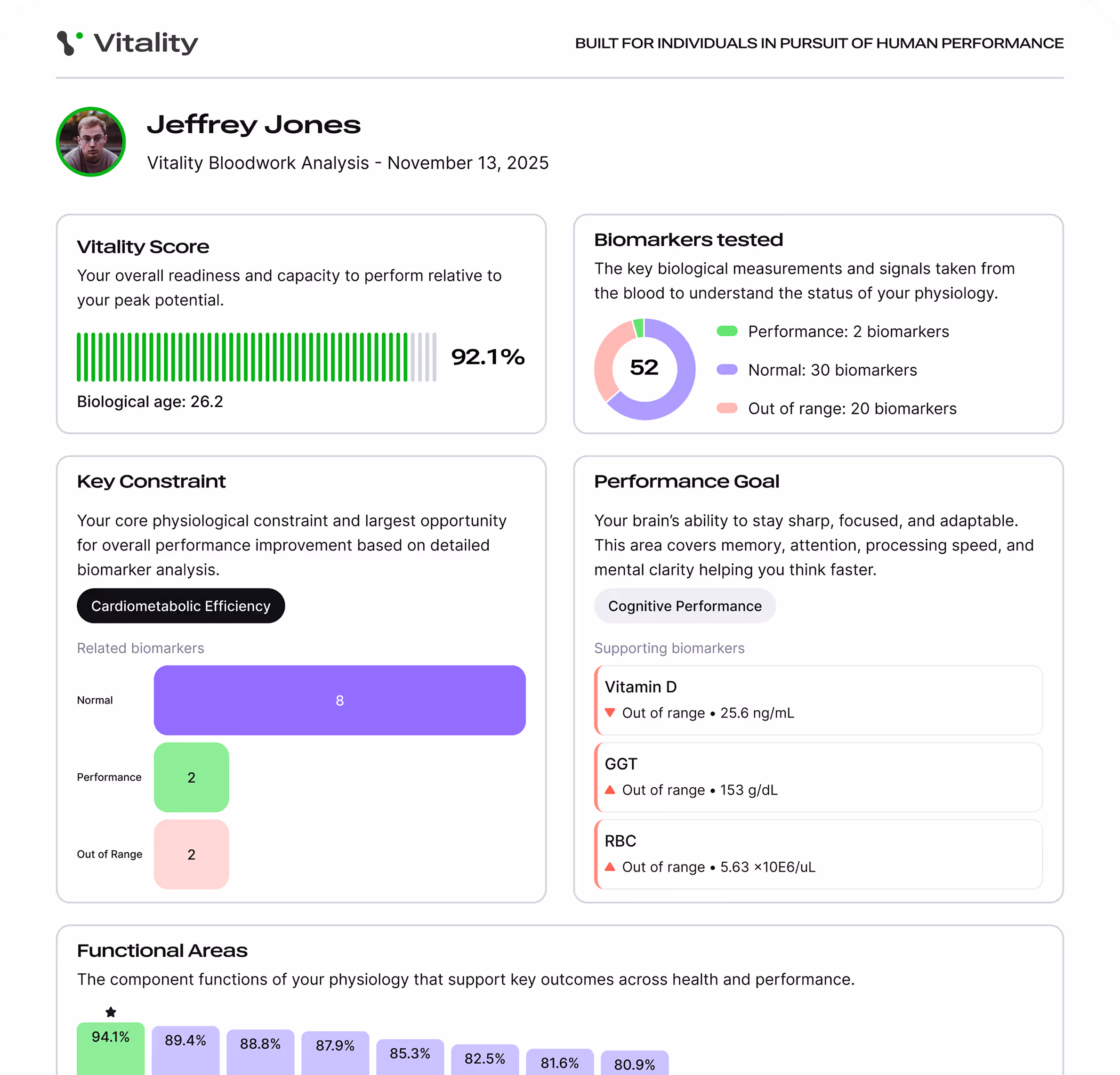 Vitality analyzes over 100 biomarkers for you, and delivers sharp, specific insights that lead to real outcomes: improved energy, better sleep, increased strength, enhanced resilience, and more.